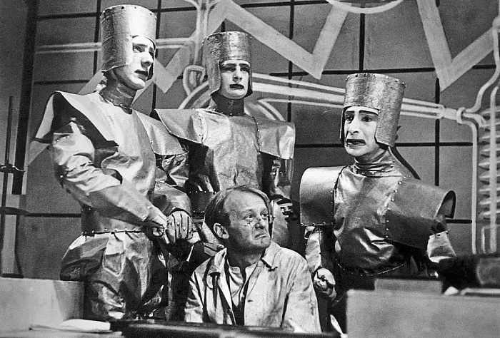 1921. R.U.R., a play by the Czech writer Karel Capek, introduced the term robot to the English language—from the Czech word, robota for “forced labor, serf,” in turn derived from rab, meaning “slave.” R.U.R.—Rossumovi Univerzální Roboti (Rossum’s Universal Robots)—became influential soon after its publication. By 1923, it had been translated into thirty languages. Though most robots are content to work for humans, eventually a rebellion causes the extinction of the human race. Above, Alquist, the last human, cannot recreate humans as requested by the robots surrounding him.